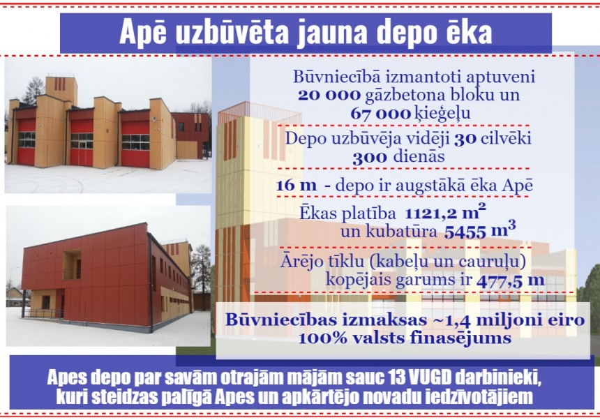 Jau ziņots, ka 2016.gada 22.februārī Apē tika nojaukta VUGD VRB Alūksnes daļas Apes posteņa ēka, kura jau sen neatbilda tehniskajām prasībām. Pēc vecās ēkas nojaukšanas nekavējoties turpat tika uzsākti jaunā depo celtniecības darbi. Jaunuzceltajā depo ēkā ir modernas, ugunsdzēsēju glābēju mūsdienu darba specifikai atbilstošas dežūrmaiņas, administrācijas un apmācību telpas, garāžas bloks ar novietni diviem ugunsdzēsības automobiļiem, speciālo automobiļu apkopes zona un mazgātava, kā arī mācību tornis.