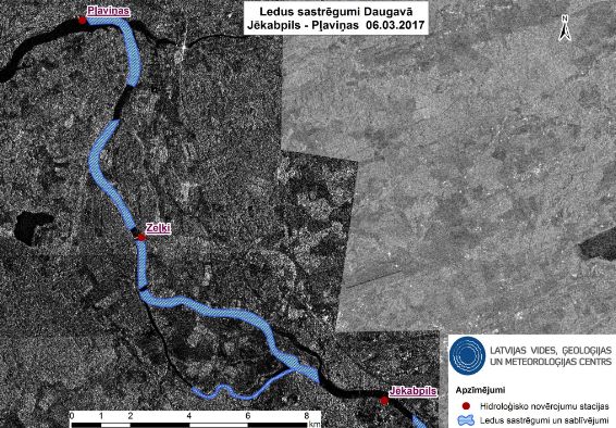 Latvijas Vides, ģeoloģijas un meteoroloģijas centra iegūtie dati no Eiropas Kosmosa aģentūras pavadoņa "Sentinel-1" liecina, ka ledus sablīvējumi un sastrēgumi Daugavā stiepjas daudzu kilometru garumā no Daugavpils līdz Pļaviņām.