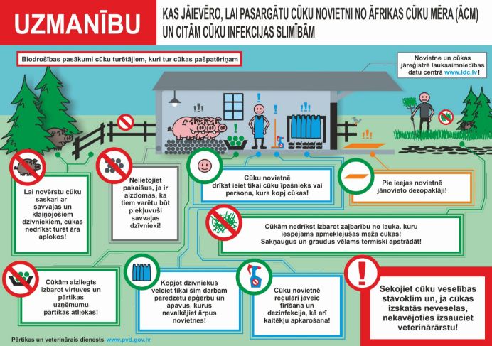 PVD atgādina visiem mājas cūku turētājiem - tikai biodrošības ievērošana var pasargāt mājas cūkas no saslimšanas ar Āfrikas cūku mēri! Īpaši svarīgi tas ir tieši šobrīd, jo kā liecina iepriekšējo gadu pieredze, vasaras mēnešos risks ienest vīrusu mājas cūku saimniecībās ir ievērojami lielāks - cilvēki vairāk pārvietojas, dodas pārgājienos, ekskursijās, tostarp dodas uz mežu, savukārt pagalmos un pļavās zeļ zāle, kuru neapzinīgāks cūku turētājs kāro izbarot cūkām.