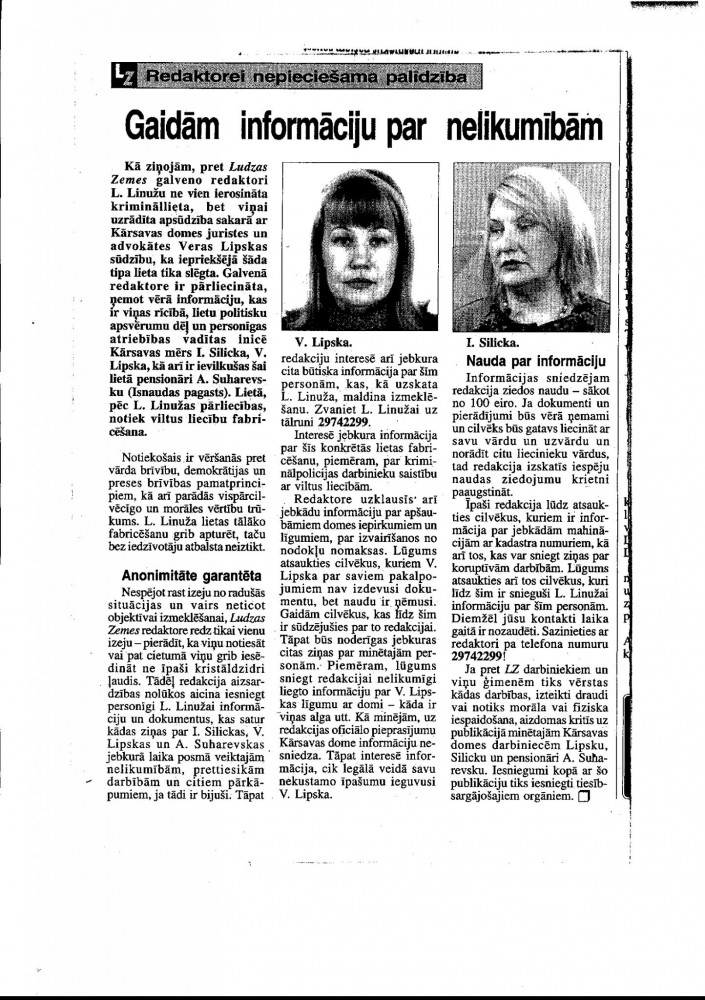 Rubrikas nosaukums - Redaktorei nepieciešama palīdzība, virsraksts - Gaidām informāciju par nelikumībām un divu personu pases tipa bildītes. Viena ir advokāte V. Lipska, otra - Kārsavas novada domes priekšsēdētāja Ināra Silicka. Redaktores ieskatā tieši viņa esot pret laikrakstu vērstās tiesāšanās kampaņas pasūtītāja. Lietas pret Ludzas Zemi tiekot fabricētas politisku apsvērumu dēļ un personiskas atriebības vārdā. Laikrakstam esot izdevies ietekmēt pašvaldību vēlēšanu rezultātus. Tas arī izklāstīts paskaidrojumos prokuratūrai. Tomēr neparasti, ka lasītājiem apmaiņā pret jebkādu kompromitējošu informāciju par šīm abām personām tiek apsolīta nauda. No simts eiro uz augšu. Un nav svarīgi, kādā laika posmā vai jomā kompromitējošie pārkāpumi notikuši. L. Linuža ir nostājusies uz kara takas un lieto visai diskutablas metodes. Naudas piedāvājums publicēts septiņus numurus pēc kārtas. I. Silicka to visu izlasījusi, saskaitījusi un arī apvainojusies, jo nesaprot, kāds viņai ar to visu sakars: «Man labāks ir slikts miers nekā labs karš. Kāpēc viņa man ir piešuvusies, es nesaprotu. Jūtos bezspēcīga!» Priekšsēdētāja vērsusies pēc padoma Latvijas Pašvaldību savienībā, kā arī Vides aizsardzības un reģionālās attīstības ministrijā. Uzrakstījusi, ka par viņu avīzē publicēti pilnīgi meli. Taču neviena ministrija nedrīkst diktēt medijiem, ko un kā rakstīt, tāpat kā nevar izsniegt universālu recepti labākai sadzīvošanai.