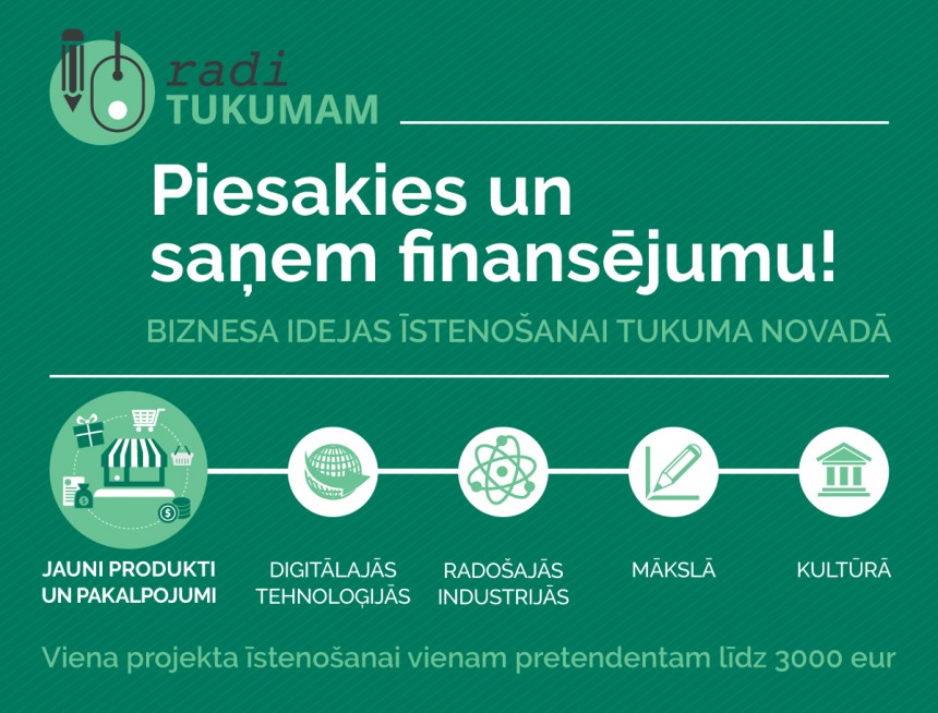 Jau ceturto gadu notiks grantu konkurss "Radi Tukumam". Konkursa mērķis atbalstīt jaunas iniciatīvas uzņēmējdarbībā, kas atbilst uzņēmējdarbības pamatprincipiem, nodrošina jaunu produktu un pakalpojumu radīšanu, veicina pilsētas identitāti un tūristu piesaisti novadam.