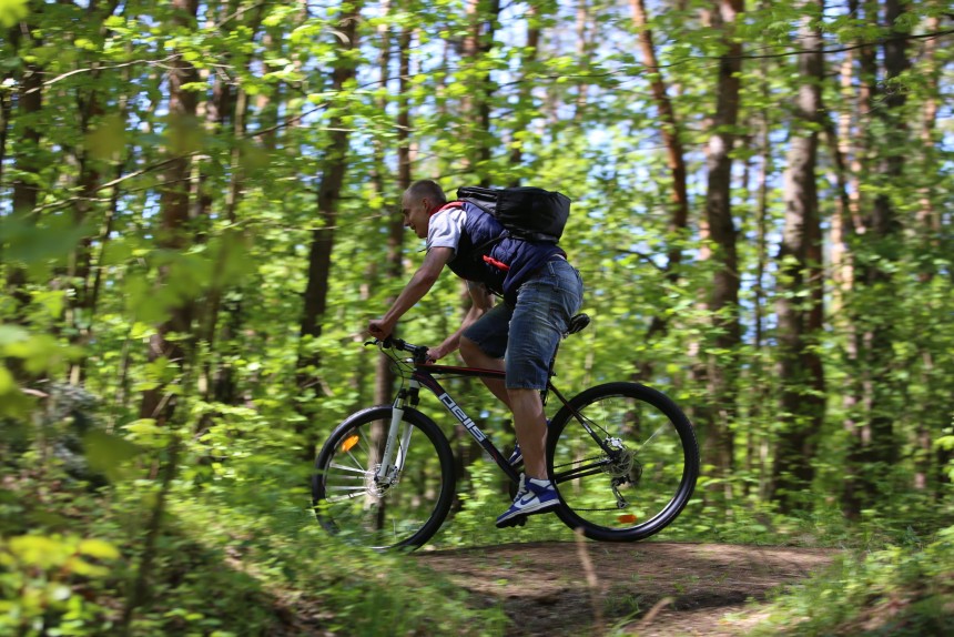 velosipēds, piemērots braukšanai pa grantētiem un zemes ceļiem, ērts, braukšanai piemērots apģērbs.