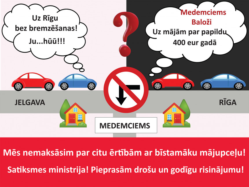 Trešdien, 3.jūnijā, plkst. 16.00 Medemciema krustojumā pie veikala norisināsies pirmā tiešsaistes protesta akcija Latvijā, kuras ietvaros Medemciema iedzīvotāji protestēs pret VAS "Latvijas Valsts ceļi" ieceri slēgt kreiso pagriezienu iebraukšanai Medemciemā no Rīgas puses, novirzot satiksmes plūsmu pa nedrošo A8 un A5 divlīmeņu satiskmes mezglu.