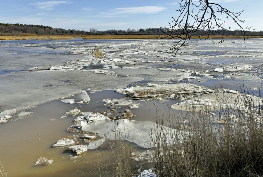 Gaujas augštecē pie Velēnas applūdušas palienes, ledus iešana turpinās Gaujā pie Valmieras.