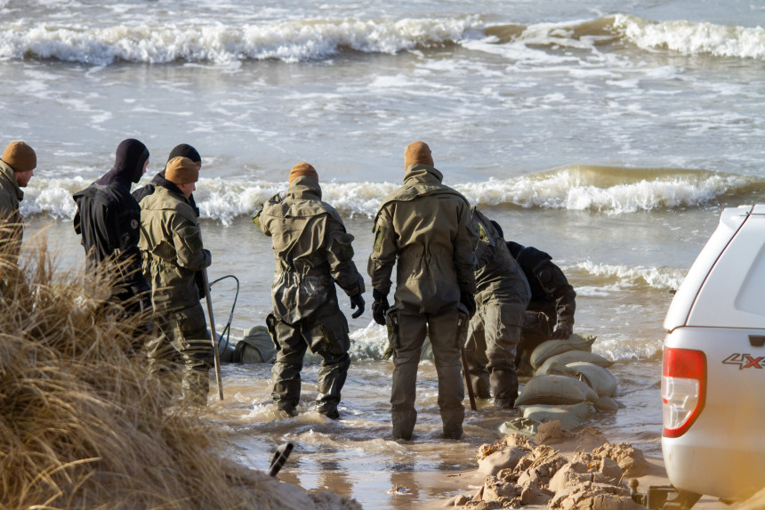 Par, iespējams, bīstamo, gandrīz pilnībā zem smilšu slāņa aprakto atradumu militārstiem jau otrdien ziņojuši iedzīvotāji, taču stiprā vēja un spēcīgo viļņu dēļ objektu nebija iespējams izcelt no smiltīm, tādēļ JS karavīri notikuma vietu tikai marķēja, informēja JS Vadības grupas sabiedrisko attiecību speciāliste Līva Veita.