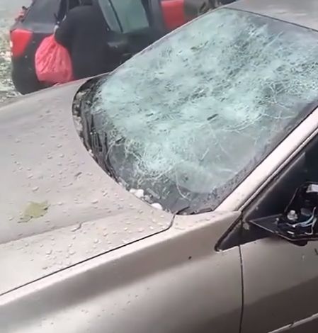 Mašīnas priekšējais stikls, priekšējie lukturi iznīcināti lupatās, zīme norauta un to visu izdarījusi pār Latviju pārskrējusie vētra ar krusas graudiem 3 centimetru izmērā!