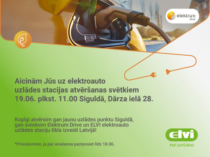 19. jūnijā plkst. 11.00 Siguldā, Dārza ielā 28, tiks atklāta pirmā "Elektrum Drive" un ELVI sadarbības ietvaros izveidotā elektroauto uzlādes stacija. Uzlādes tīkls aptvers 13 Latvijas pilsētas.