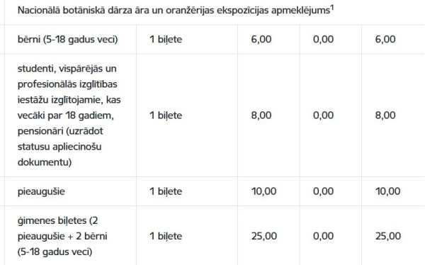 Nacionālā botāniskā dārza āra un oranžērijas ekspozīcijas apmeklējums 6 līdz 10 eiro.