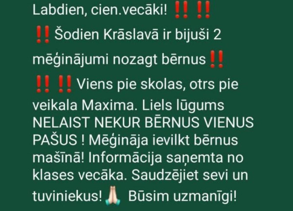 Dažādās "Facebook" grupās izplatījās informācija ar apgalvojumu, ka bijuši mēģinājumi nozagt bērnus.
