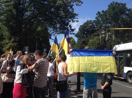 Kā aģentūrai LETA skaidroja Latvijas ukraiņu kongresa pārstāve Oksana Lazda, protesta akcija tiek rīkota, lai demonstrētu atbalstu Ukrainai un nosodītu Krievijas prezidenta Vladimira Putina agresiju.