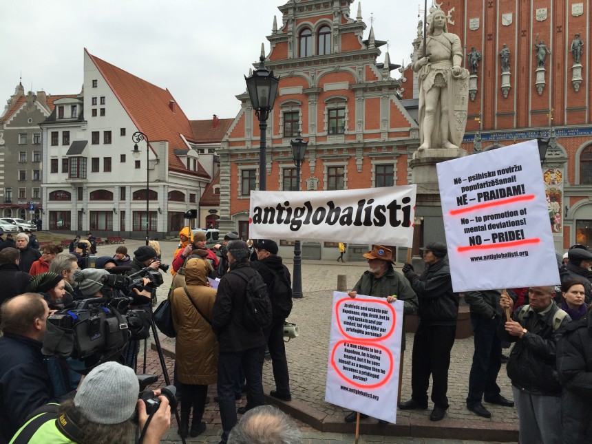 Pie Rīgas domes pulcējas biedrības "Antiglobālisti" pārstāvji, kā arī viņu atbalstītāji no citām organizācijām. Kā novēroja LETA, protesta dalībnieki tur rokās plakātus ar uzrakstiem, aicinot Rīgas domi neatļaut Eiropraida norisi Rīgā. Protesta dalībnieki uzsver, ka homoseksuālas orientācijas cilvēkiem ir psihiskas novirzes.