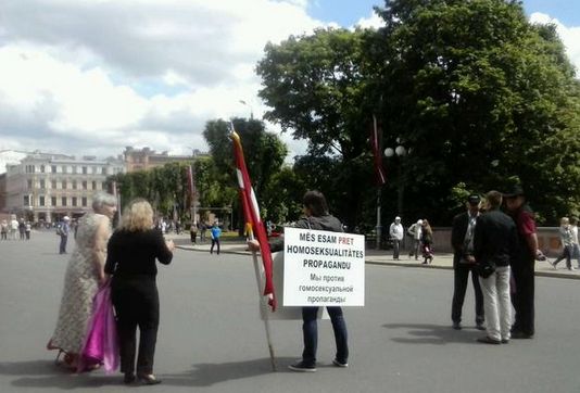 Jau pirms gājiena sākšanās pie Brīvības pieminekļa pulcējas vairāki cilvēki, kas pauž negatīvu attieksmi pret šo pasākumu. Vienam no viņiem rokās ir Latvijas karogs un piekarināts plakāts, kurā teikts "Mēs esam pret homoseksualitātes propagandu".