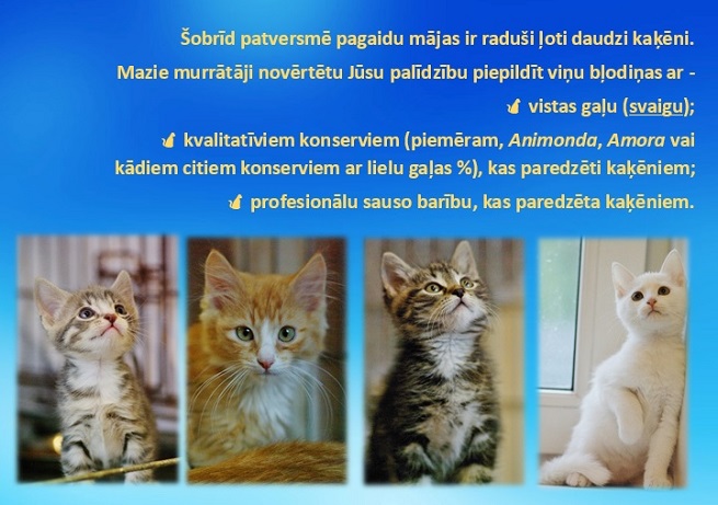 Patversmē pajumti esot raduši ļoti daudzi mazi kaķēni un lai tos pilnvērtīgi pabarotu nepieciešama līdzcilvēku palīdzība. Kaķēniem noderētu svaiga vistas gaļa vai speciāli kaķēniem paredzēti konservi un sausā barība.