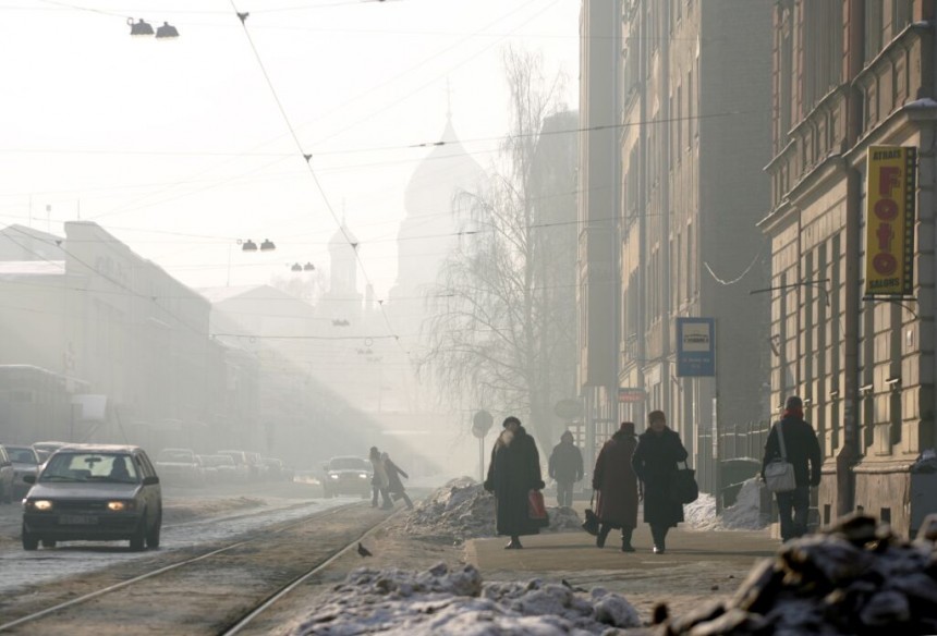 Smogu rada bezvējš, vēsais laiks, apkures katlu un skursteņu dūmi, automašīnu izplūdes gāzes.