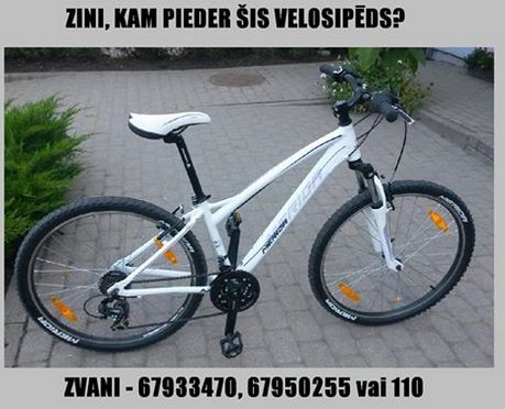 Policija aicina aplūkot attēlā redzamo velosipēdu un gadījumā, ja kāds zina tā īpašnieku, zvanīt Valsts policijai uz tālruņa numuriem 67950255 vai 110, vai Mārupes novada pašvaldības policijai uz tālruņa numuru 67933470.