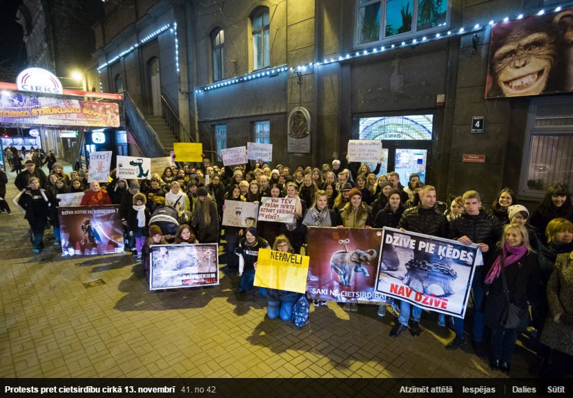 “Protestā pret dzīvnieku izmantošanu cirkā piektdien, 13. novembrī pie Rīgas cirka bija sapulcējušies ap 100 cilvēku.VSIA "RĪGAS CIRKS" izmisīgi centās slāpēt protestu, novietojot uz palodzēm skandas un caur atvērtiem logiem atskaņojot skaļu mūziku un paziņojumus par kabatzagļiem. Protesta akcija tika plaši atspoguļota medijos. LTV1 gan veidoja tiešraidi no notikuma vietas, gan rādīja to ziņu raidījumā "Panorāma". Protesta norisi iemūžināja arī LNT un ziņu aģentūra Leta. Paldies visiem, kas piedalījās un palīdzēja noorganizēt šo akciju!” savā facebook lapā atklāj un visiem pasakās protesta organizatori “Dzīvnieku brīvība”.
