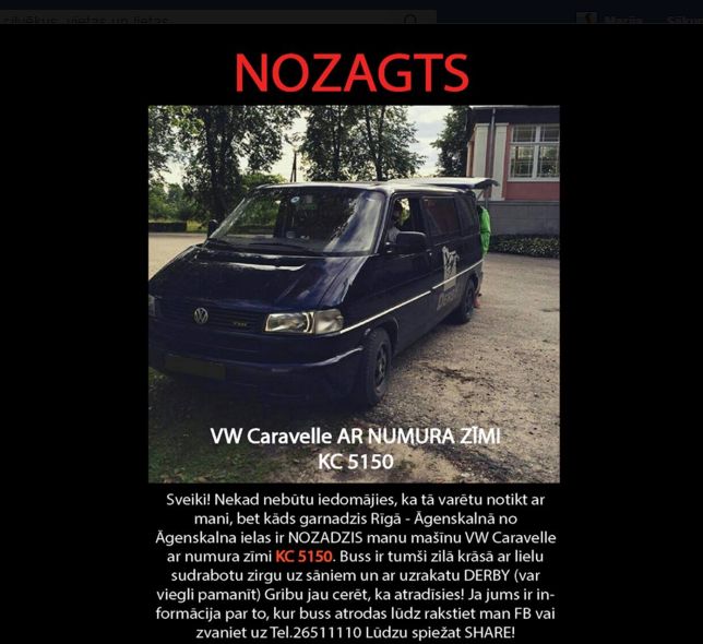 Automašīna VW Caravelle ar numurzīmi KC 5150 nozagta no kāda pagalma Āgenskalnā. Ja kādam ir informācija par to, kur varētu atrasties nozagtā automašīna, tās īpašnieks lūdz zvanīt uz tālruņa numuru – 26511110.