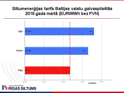 Siltumenerģijas tarifs martā Rīgā ir arī mazākais Baltijas valstu galvaspilsētu vidū. Tas ir par 22% mazāks nekā Tallinā un par 29% mazāks, salīdzinot ar apstiprināto siltumenerģijas tarifu Viļņā.