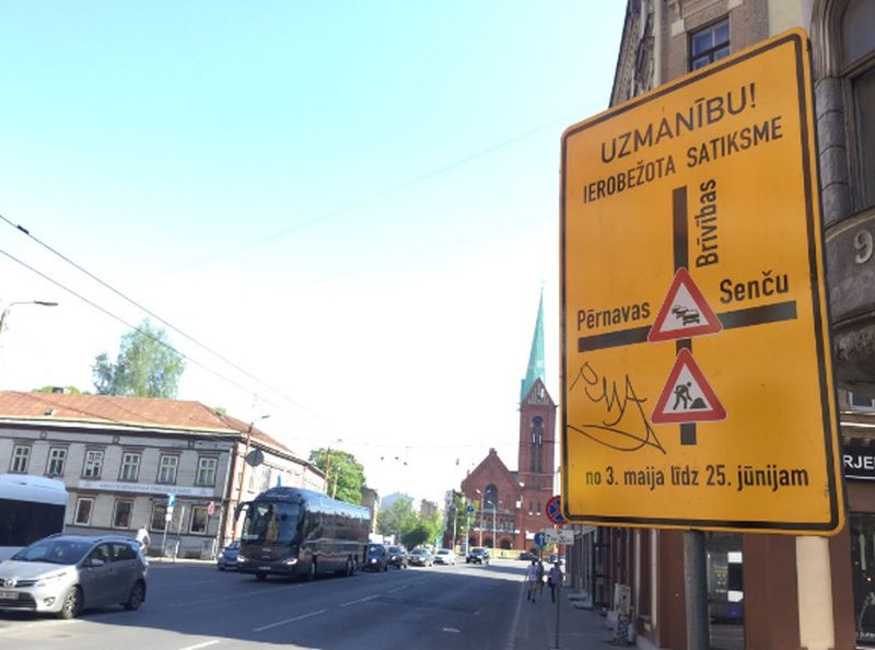 Ceļa zīmē redzams, ka posmā starp Pērnavas un Senču ielām no 3. līdz 25. maijam notiks ceļa remonta darbi. Tomēr, tā kā ceļa zīme ir novietota uz Brīvības ielas, virzienā uz Juglu, tajā attēlots, ka Senču un Pērnavas ielas ir samainītas vietām.
