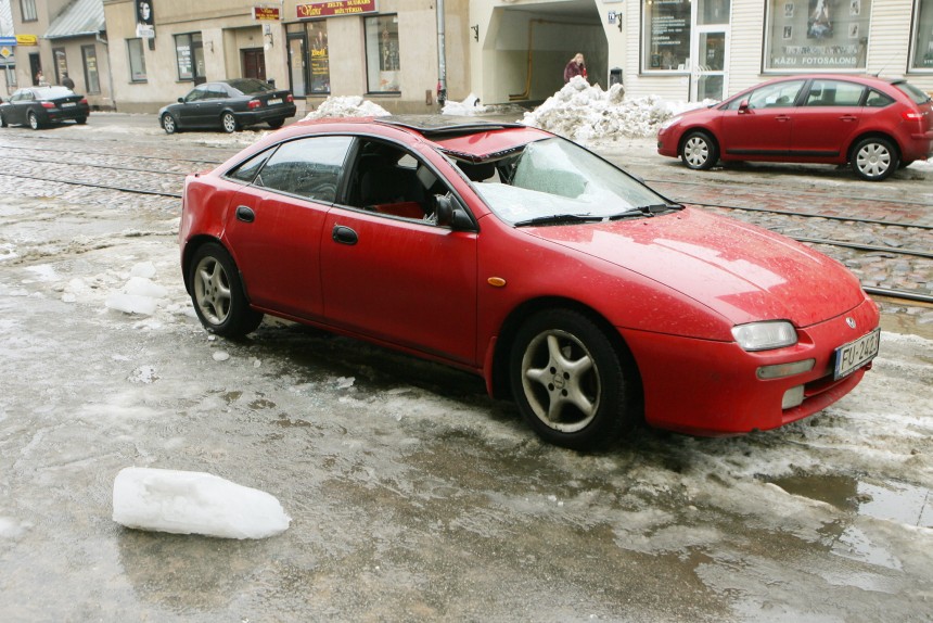 Šodien Rīgas centrā, Barona ielā krītošs ledus gabals sadauzīja ielas malā novietotu : "Mazda" markas automašīnu.