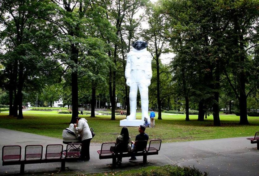 Rīgas mērs Nils Ušakovs informē, ka līdz pat šī gada oktobra beigām Kronvalda parkā Rīgā "dzīvos" pērtiķis skafandrā.