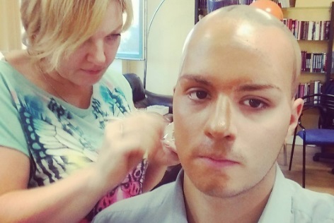 Ruskis raksta: "Lieki piebilst, ka esmu jau grimma krēslā! Mati uz nullīti, ādas krāsa mainās... Jau tagad ir jautri!"
