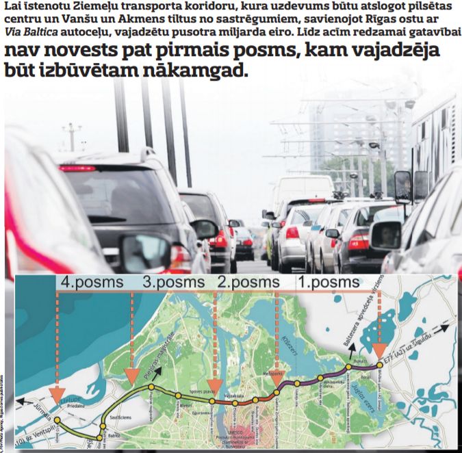Ziemeļu koridora sapnis, ar kuru galvenokārt jau Pārdaugavas iedzīvotāji tika ieaijāti gandrīz 20 gadu, ir izsapņots. Lai īstenotu Ziemeļu transporta koridoru, kura uzdevums būtu atslogot pilsētas centru un Vanšu un Akmens tiltus no sastrēgumiem, savienojot Rīgas ostu ar Via Baltica autoceļu, vajadzētu pusotra miljarda eiro. Līdz acīm redzamai gatavībai nav novests pat pirmais posms, kam vajadzēja būt izbūvētam nākamgad. Iecere apspriesta jau kopš pagājušā gadsimta 90. gadu beigām, izlietoti vairāki miljoni eiro, bet vēl viens Daugavas šķērsojums Rīgas brīvostas tuvumā aizvien ir mirāža.