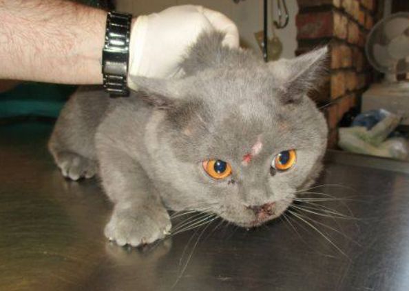 Kaķis ir aptuveni divus gadus vecs, runcim ir pelēki zilganas krāsas kažoks. Mincim ir galvas trauma, iespējams gūta krītot no augstuma vai pakļūstot zem auto!