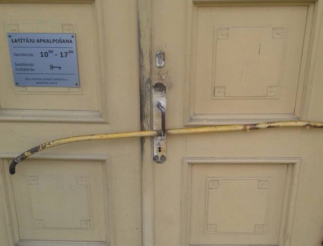 "Vandāļi pastrādājuši pie Latvijas Neredzīgo bibliotēkas. Nepietiek, ka nolausti neredzīgiem cilvēkiem orientieri, daļa no tā šorīt ievērta durvīs. Vai nav idiotisms!?" dusmīga ir G. Bite.