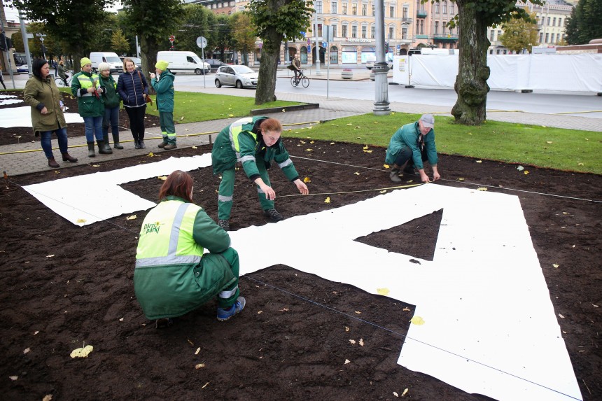 Pagājušajā nedēļā veikta vasaras ziedu stādījumu izņemšana, plānotās dobes kontūras nospraušana dabā, dobes gultnes rakšana un pildīšana ar auglīgo augsni un bagātināto kūdru, kā arī paklājzāliena ieklāšana pie dobes. Savukārt šonedēļ sagatavošanas darbi turpinās ar dobes zīmējuma - burtu un simbolu - nospraušanu dabā un teritorijas sagatavošanu sīpolu stādīšanai trešdien.