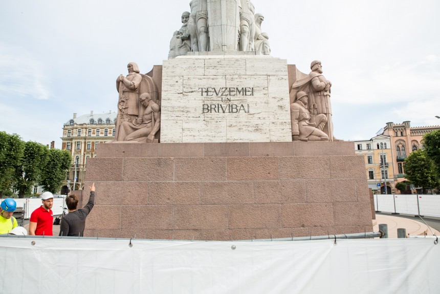 Jau vēstīts, ka pirms gada pie Brīvības pieminekļa tika novietotas trīs no bronzas veidotas mākslinieciski informatīvās plāksnes. Tās tika iestrādātas asfalta segumā un uz plāksnēm četrās valodās - latviešu, angļu, krievu un vācu - izvietota informācija par pieminekļa autoriem, izveidošanas gadu un to, ka Brīvības piemineklis celts par tautas ziedojumiem.