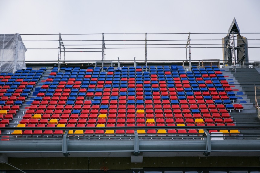 Jauno tribīņu virs zemes paceltā konstrukcija ļaus apmeklētājiem brīvi pārvietoties zem tribīnēm, atvieglojot kultūras un sporta pasākumu norisi.