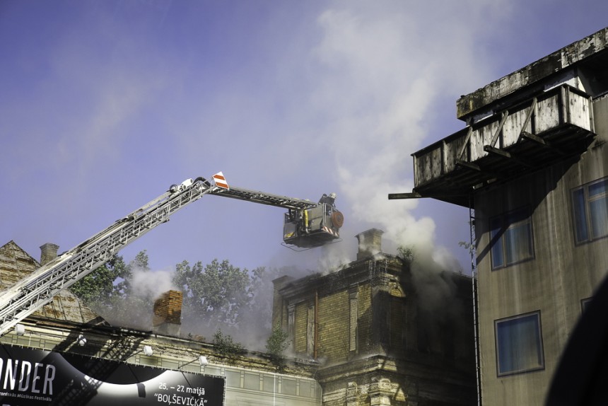 Plkst.18.23 ugunsgrēks tika lokalizēts, taču joprojām deg ēkas bēniņi un trešais stāvs 350 kvadrātmetru platībā.