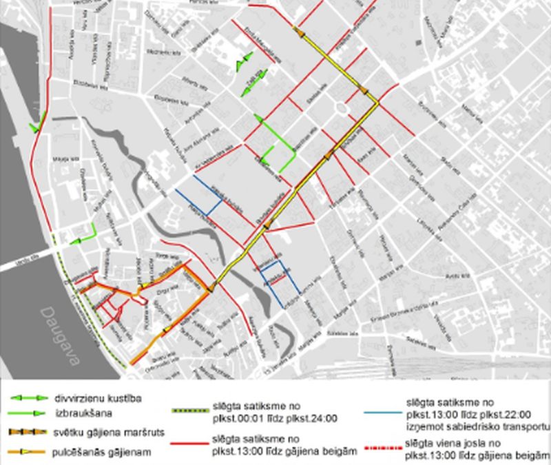 Savukārt no plkst. 13.00 līdz gājiena beigām satiksmi slēgs vai ierobežos: