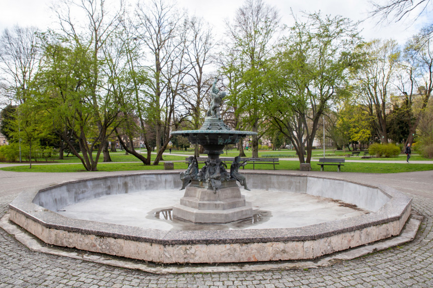 Vērmanes dārza strūklakas "Gadalaiki" betona pārklājums, kas sācis lobīties un atsegt zilās flīzes, esot pagaidu risinājums.
