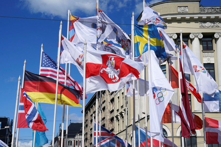 Pirmdien Rīgā, pie viesnīcas "Radisson Blu Hotel Latvija", kur izlikti pasaules čempionāta hokejā dalībvalstu karogi, Baltkrievijas oficiālais karogs tika nomainīts pret Baltkrievijas vēsturisko sarkanbalto karogu.