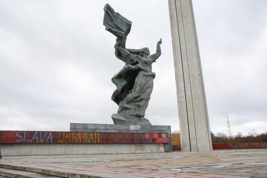Rīgā, Uzvaras parkā esošais Piemineklis Padomju Latvijas un Rīgas atbrīvotājiem no vācu fašistiskajiem iebrucējiem aizvadītajā naktī ir apliets ar Ukrainas karoga krāsām