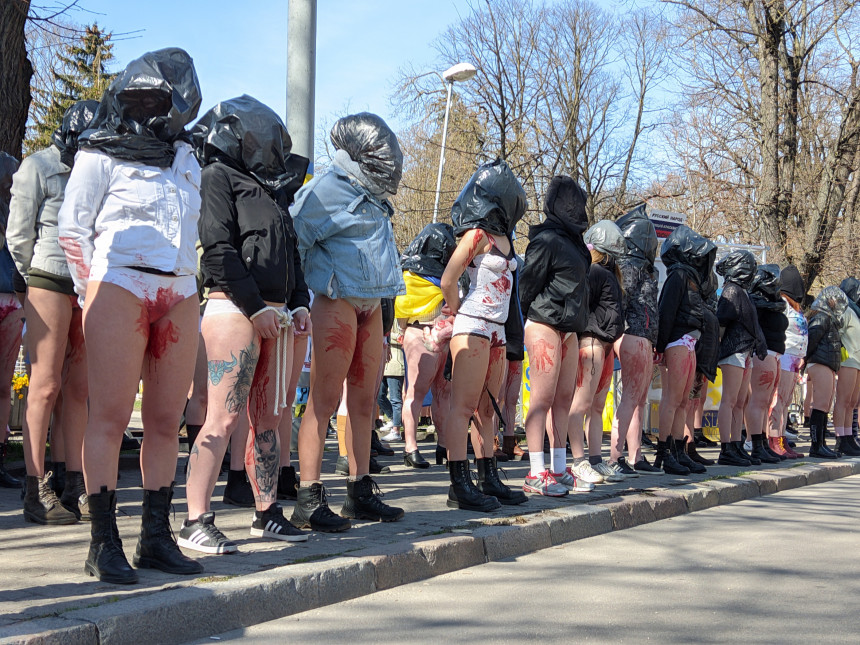 Protesta akcijā, simboliski ilustrējot seksuālās vardarbības nežēlību, pretim Krievijas vēstniecībai bija pulcējušās sievietes baltā apakšveļā, kas notraipīta asiņu krāsā, ar aizsegtām sejām un aiz muguras sasietām rokām.