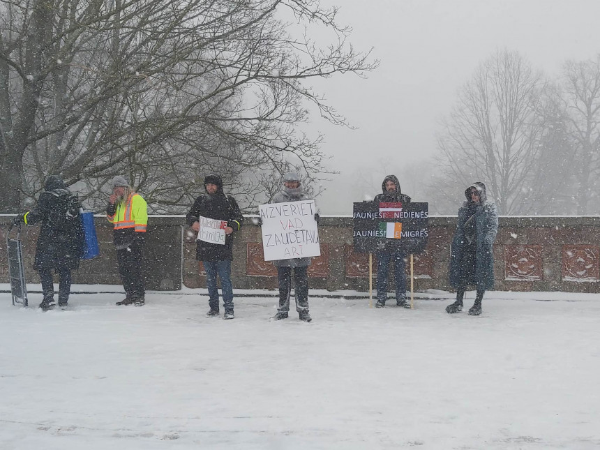 Sestdien ap plkst.14 Rīgas centrā, laukumā pie Brīvības pieminekļa, aptuveni desmit cilvēki sapulcējās, lai, spītējot sniegputenim, protestētu pret obligātā militārā dienesta ieviešanu, novēroja LETA.