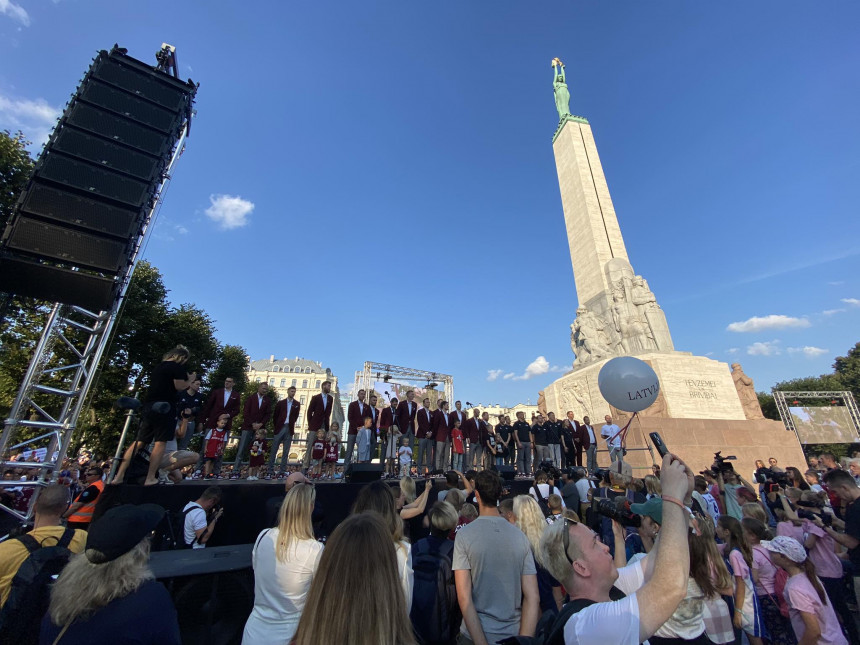 Laukumā pulcējušies vairāki tūkstoši cilvēki, daudzi no viņiem tērpušies izlases kreklos vai līdzīgās drēbēs. Spēlētāji uz skatuvi, kas izvietota pie Brīvības pieminekļa, devušies pa koridoru caur pūli.