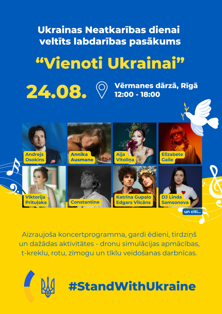 Sestdien, 24.08.2024., Rīgā, Vērmanes dārzā, notiks Ukrainas vēstniecības Latvijā organizēts Ukrainas neatkarības dienas pasākums “Vienoti Ukrainai”. Pasākums tiks sākts ar svētku koncertu, kurā dalību apstiprinājuši pazīstami pašmāju un Ukrainas skatuves mākslinieki.