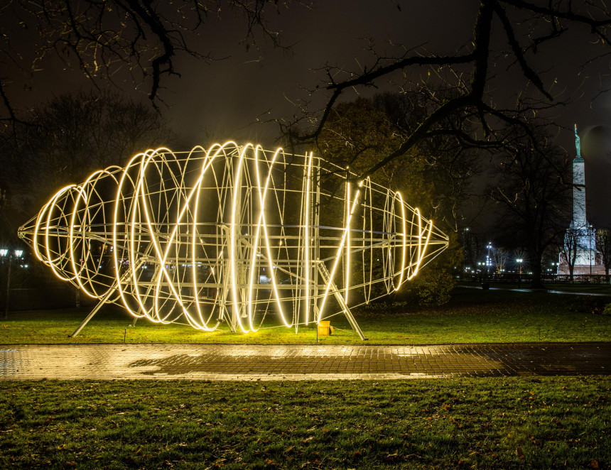 Rīgā, pie Pilsētas kanāla, izvietots liela izmēra gaismas dirižablis, aģentūru LETA informēja "December Design" dibinātājs un dizainers Kristaps Štobis.
