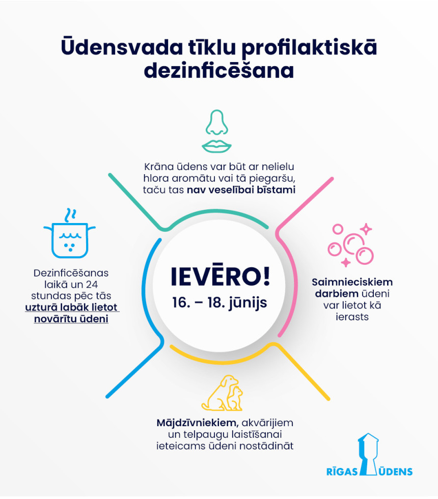 SIA "Rīgas ūdens" Informē, ka no pirmdienas, 16. jūnija līdz trešdienai, 18. jūnijam, plānota Rīgas ūdensvada tīklu profilaktiskā dezinficēšana jeb hlorēšana.