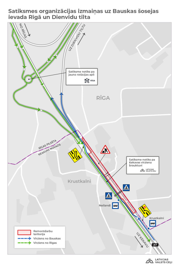 Pie Bauskas šosejas (A7) ievada Rīgā turpinās gājēju un velosipēdistu infrastruktūras būvdarbi, kurus organizē VSIA "Latvijas valsts ceļi" (LVC), kā arī Dienvidu tilta 4. kārtas izbūve, ko organizē Rīgas pašvaldība. Tuneļa būvdarbi zem Bauskas šosejas ievada Ķekavas virziena brauktuves ir pabeigti tādā apmērā, lai varētu pārslēgt satiksmi tuneļa zonā no kreisās brauktuves uz labo brauktuvi, un būvnieki turpinās darbus zem Rīgas virziena brauktuves, ar ko saistītas izmaiņas satiksmes organizācijā.