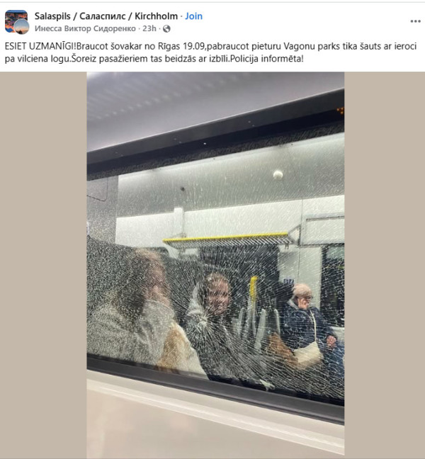 Esiet uzmanīgi! Braucot šovakar no Rīgas 19.09, pabraucot pieturu "Vagonu parks" tika šauts ar ieroci pa vilciena logu, 10. martā vietnē "Facebook" rakstīja kāda "Vivi" pasažiere.