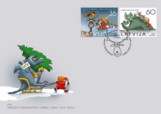 Pastmarkā ar nominālvērtību 0,60 Ls redzams 2012. gada galvenais simbols – pūķis, kurš šoreiz palīdz Ziemassvētku vecītim nogādāt dāvanas lieliem un maziem svētku svinētājiem visā pasaulē. Šīs pastmarkas izdotas 300 000 eksemplāru tirāžā, un ar šādu nominālvērtību tās var izmantot starptautiskas vēstules nosūtīšanai uz visām valstīm ārpus Eiropas Savienības.