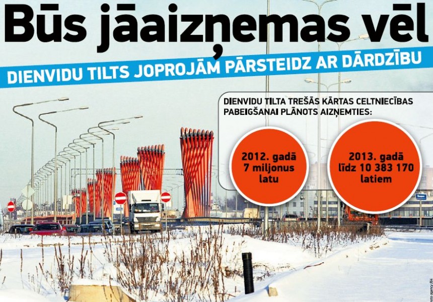 Rīgas domes sēdē šodien paredzēts izskatīt lēmumprojektu par Dienvidu tilta trešās kārtas būvniecību šogad un nākamgad. Pašvaldības Satiksmes un transporta lietu komiteja ir akceptējusi līguma slēgšanu ar uzņēmumu ACB, Tilts un Viadukts, kas uzvarēja konkursā par tilta trešās kārtas būvniecības pabeigšanas darbu izpildi. Šī apvienība iesniedza visizdevīgāko piedāvājumu. Līgums ar iepriekšējo būvnieku – akciju sabiedrību Transport Systems – tika lauzts pagājušajā gadā pēc uzņēmēju lūguma, jo Dienvidu tilta trešās kārtas būvdarbi finansējuma trūkuma dēļ bija pārtraukti jau 2010. gada vidū. Pagājušā gada decembrī Rīgas dome izsludināja jaunu iepirkuma konkursu par būvdarbu pabeigšanu.