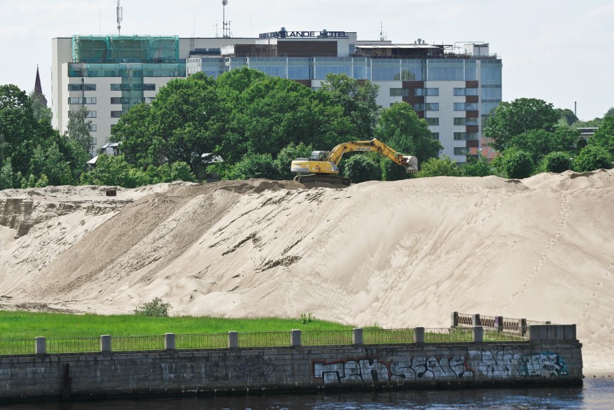 Ekskavatori upes krastā vakar rūca, kravas mašīna stāvēja, bet vai pusotras nedēļas laikā daudzus tūkstošus kubikmetru noraks, nav zināms. Rīgas dome vicemēra Andra Amerika personā ir piedraudējusi, ka kavējuma gadījumā pašvaldība šo kalnu novāks, bet iztērēto naudu piedzīs no uzņēmēja, kurš iegādājās tiesības dabūt un arī izvest smilti. Arhitektūras platformā www.A4D.lv ir izteiktas aizdomas, kāpēc tik apjomīgus būvdarbus veic bez projekta saskaņošanas. «Nav ne būvtāfeles, ne cita veida informācijas, kas iedzīvotājus iepazīstinātu ar būvdarbu mērķi un pasūtītāju, kā tas parasti tiek prasīts. Rīgas būvvalde informē, ka šī esot tikai smilšu pagaidu novietne, (..) līdz ar to projekta saskaņošana un darbu veikšanas atļaujas izņemšana neesot nepieciešama. Šis pagaidu režīms acīm redzami ļāvis pat tik apjomīgus zemes darbus neklasificēt kā būvdarbus, līdz ar to izvairoties no projekta saskaņošanas un citām formalitātēm, kuras būtu jāveic, ja šādus darbus iecerētu kāds cits, nevis Rīgas brīvosta. Netaisnīgi, jo, piemēram, citviet Ķīpsalā par būvdarbiem tiek uzskatīta pat salīdzinoši neliela zemes virskārtas planēšana!» teikts rakstā Ķīpsalas smilšu kalns un riski.