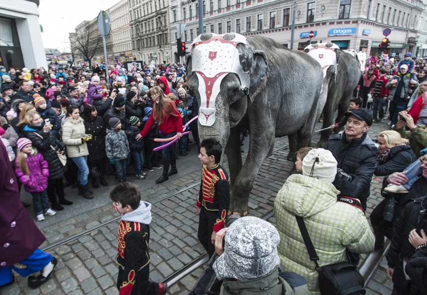 Šodien Rīgā notikušo simbolisko ziloņu gājienu apkārt Rīgas cirkam šodien ieradās apskatīt vairāki tūkstoši cilvēku.