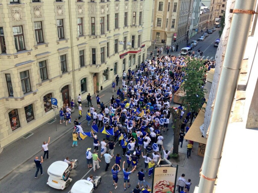 Simtiem Bosnijas un Hercegovinas futbola izlases fanu šo pēcpusdien Rīgas centrā sāka "iesildīties" vakarā gaidāmajai spēlei ar Latvijas valstsvienību. Kā novēroja aģentūra LETA, līdzjutēju pūļi lielā skaitā drūzmējas Līvu laukumā, kur izvietotās āra kafejnīcas izrotātas ar Bosnijas un Hercegovinas karogiem. Fani malko alu, ietur pusdienas, dzied dziesmas un rada troksni, sitot plaukstas, pūšot plastmasas taures un dauzot bungas.